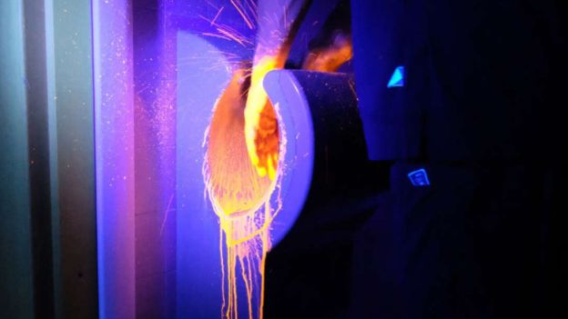 Luz ultravioleta mostra, em um dos testes, como as bactérias se espalham com o jato de ar do secador Imagem: UNIVERSIDADE DE LEEDS